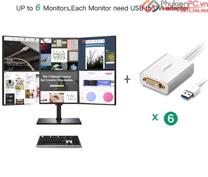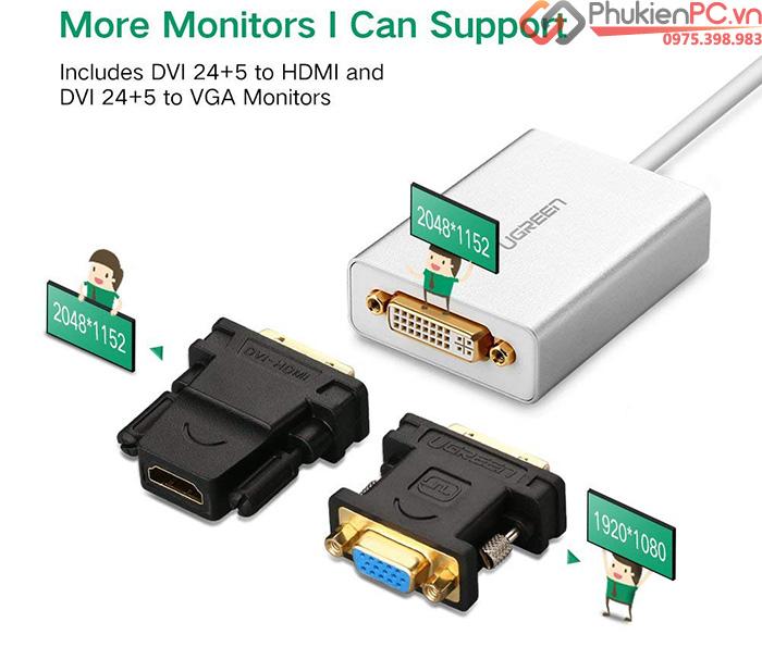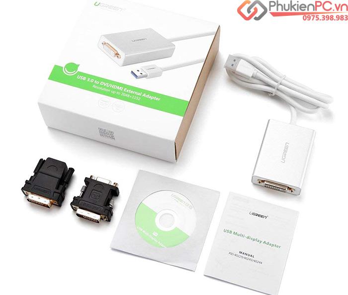 Đi kèm Ugreen 40343 USB 3.0 to HDMI/DVI/VGA 2 đầu giắc DVI to HDMI, DVI to VGA. Sử dụng cho các loại màn hình, Tivi, máy chiếu khác nhau.