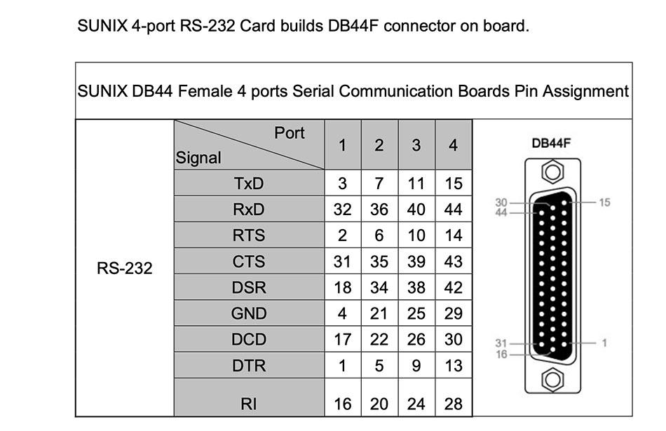 Card không kèm cáp DB44 to 4 COM RS232, bên dưới phukienpc.vn cung cấp sơ đồ, bạn có thể tự hàn cáp này.